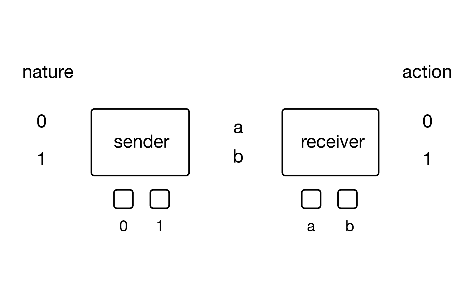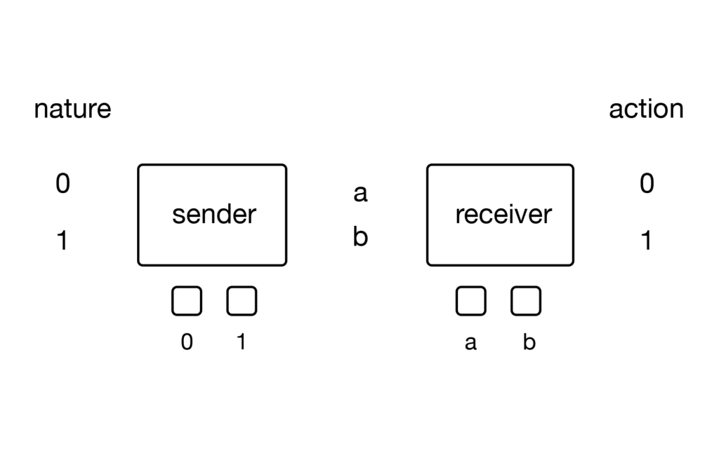 Consider a concrete example. Suppose state 0 is “it’s sunny,” state 1 is “it’s raining,” signal a is “flash a green light,” signal b is “flash a blue light,” action 0 is “take two straw hats to the picnic” (the right thing to do on a sunny day) and action 1 is “take two umbrellas to the picnic” (the right thing to do on a rainy day). Here the sender wants to send a signal that communicates the weather to the receiver, and the receiver wants to take straw hats if it is sunny and umbrellas if it is raining. But the green and blue signals are meaningless, so there is initially no way to communicate.