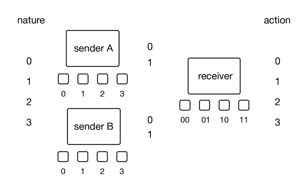 Figure 2: The Coding Game. At the start of each play, nature takes one of four states at random. Each of the two senders sees that state then chooses a signal of 0 or 1 from her corresponding urn (the four small boxes below each sender). The receiver sees both signals and draws an action from his corresponding urn (the four small boxes labeled with the two signals he might see). The receiver’s action is successful if and only if it matches the current state of nature.
