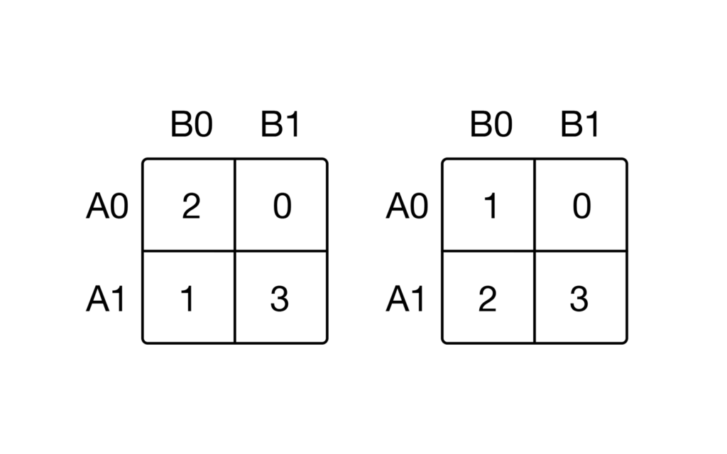 Figure 3: Two codes. The left and right matrices represent perfectly efficient codes the sender and receiver might spontaneously invent on a run of the coding game. The code that emerges in play is randomly determined as the agents learn by trial-and-error reinforcement.